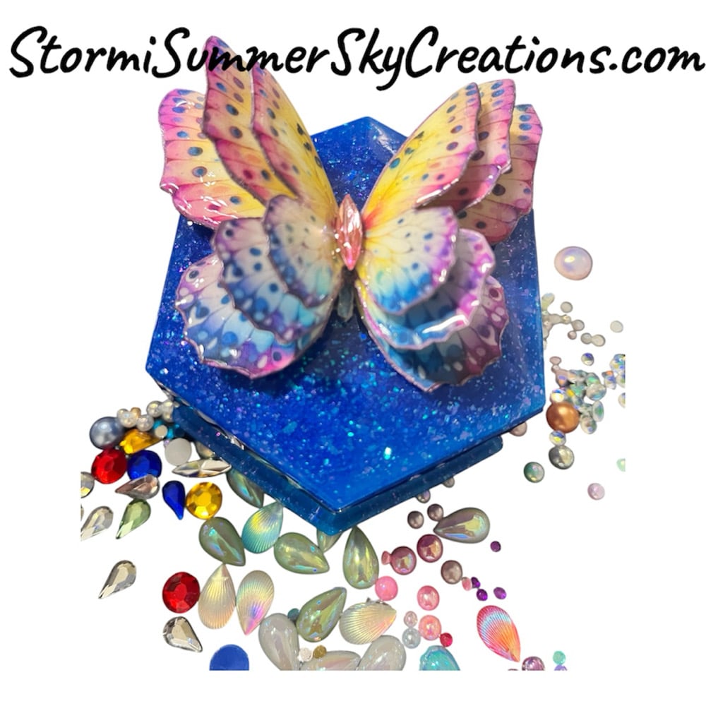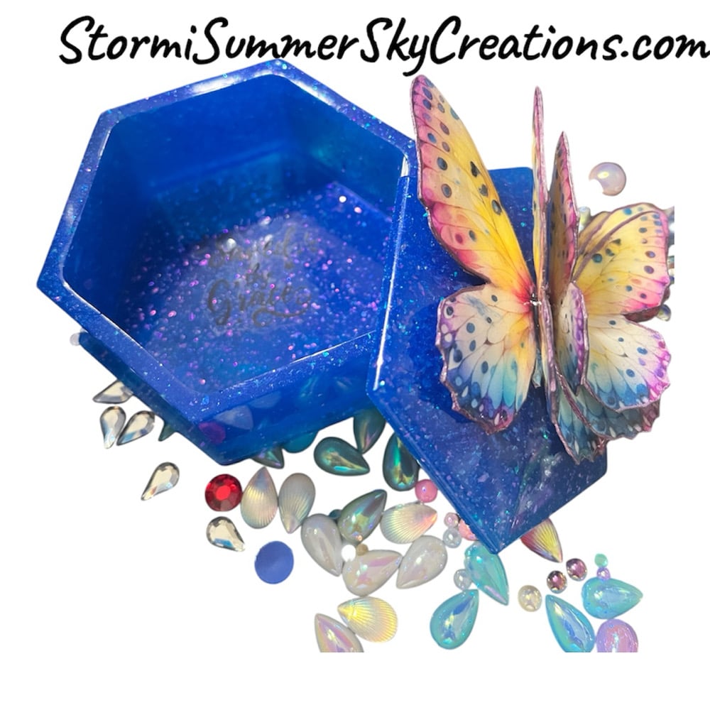Beautiful Small Blue Octagon shaped with Beautiful handmade Butterfly Prayer/Trinket box