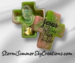 Pink and Green Prayer/Trinket Box. Comes with handmade cross stand and a little Jesus.