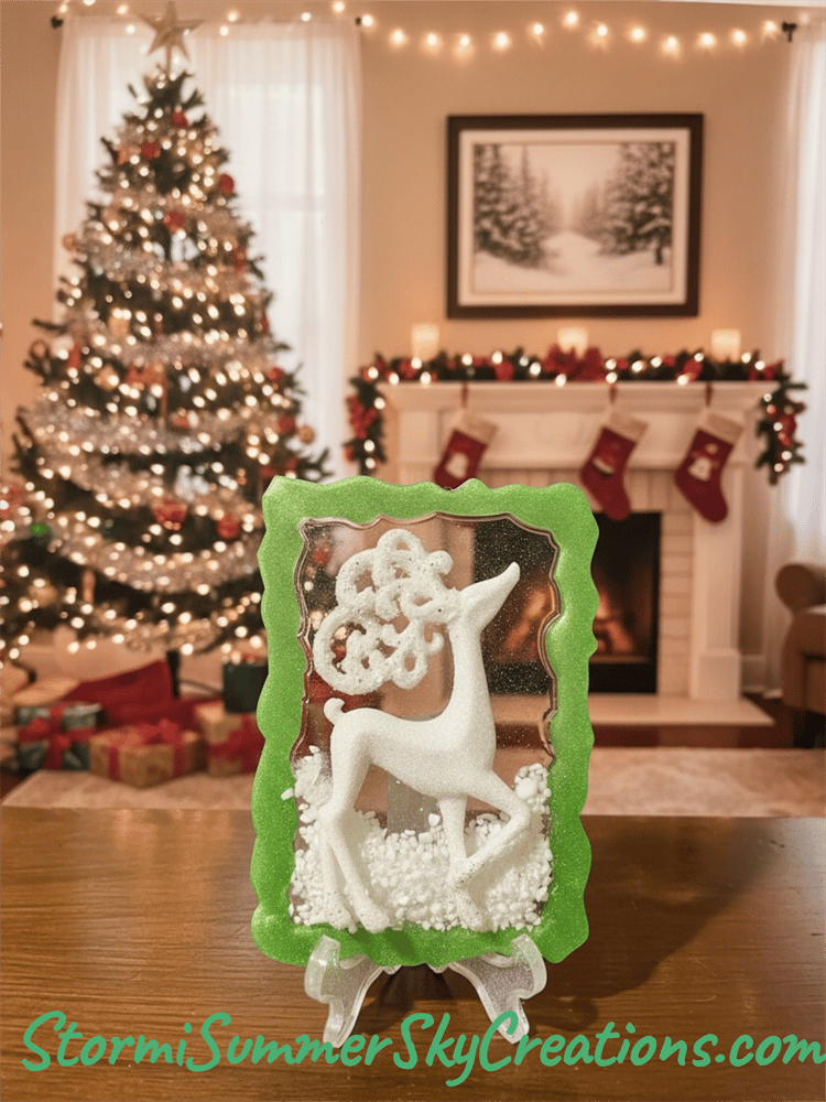 White Reindeer with Green Frame. Comes with matching stand.